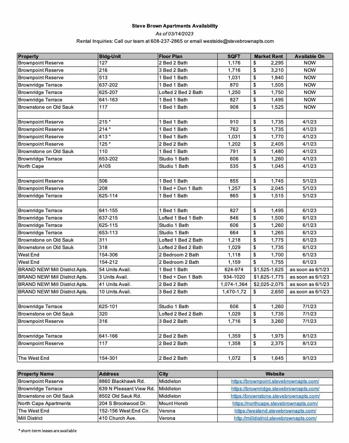 Use the link below to see all the apartments Steve Brown Apartments currently has available for rent in the Verona, Middleton, Madison, and Mount Horeb areas of Wisconsin. This list is updated every two weeks!
